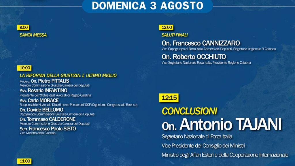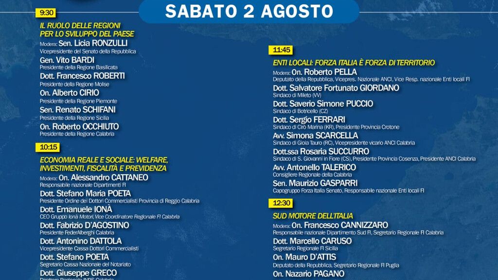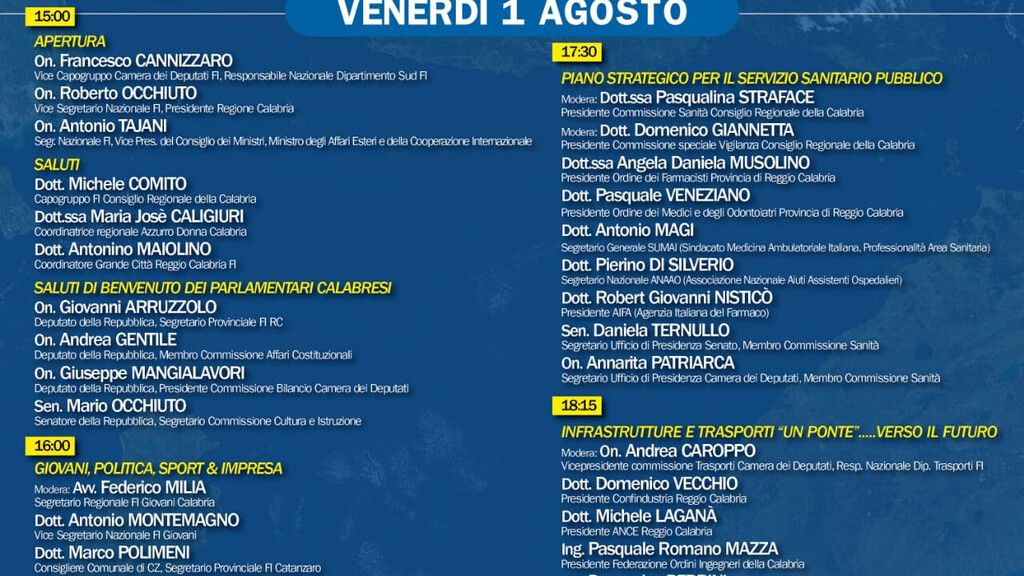 "Le radici del Sud la Forza dell’Italia" è arrivata a conclusione del percorso, dopo aver toccato ogni regione del Mezzogiorno e la tappa calabrese segnerà, di fatto, la convergenza di tutti gli esponenti di Forza Italia delle diverse parti del Paese, che si ritroveranno in riva allo Stretto insieme allo “stato maggiore” del partito al completo. Non è mai accaduto prima. Nella 3 giorni del Kalura, infatti, insieme ad Antonio Tajani, interverranno tutti i Ministri azzurri, i Sottosegretari, entrambi i capigruppo di Camera e Senato, oltre 50 parlamentari e dirigenti nazionali, 4 eurodeputati, 5 presidenti di regione (Basilicata, Calabria, Molise, Piemonte, Sicilia), oltre ad autorevoli personalità del mondo dell'imprenditoria, degli ordini professionali e delle associazioni di categoria. Sarà, dunque, un'occasione più unica che rara per confrontarsi affrontando temi fondamentali per lo sviluppo dei territori e di tutto il Paese.
