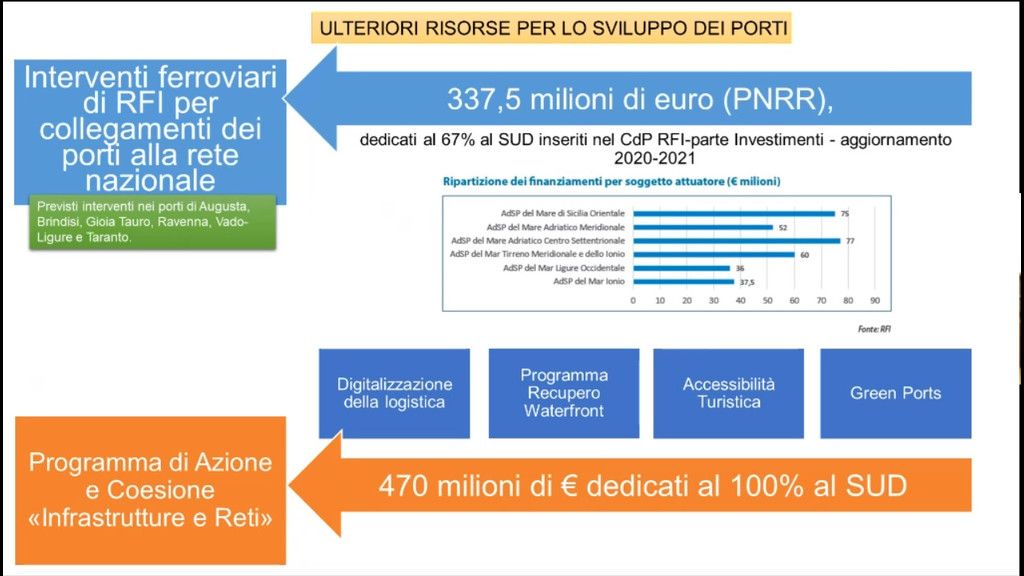 Nello specifico, le riforme della gestione del sistema portuale riguardano il nuovo processo di pianificazione strategica degli ambiti portuali; l’attuazione di un regolamento per l’aggiudicazione competitiva delle concessioni nelle aree portuali; semplificazione delle procedure di autorizzazione degli impianti di cold ironing; la piattaforma logistica nazionale per la rete dei porti e degli interporti.