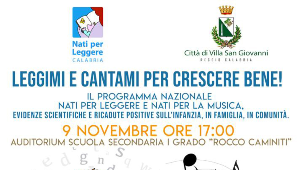 Per questo motivo - conclude la nota -,  mercoledì 9 novembre presso l’Auditorium della scuola secondaria di I grado “Rocco Caminiti” si terrà l’incontro dal titolo “Leggimi e cantami per crescere bene". Il programma nazionale è promosso dall’Amministrazione in collaborazione con il coordinamento regionale “Nati per Leggere”. L'evento prevede in apertura i saluti istituzionali del Presidente del Consiglio comunale e della dirigente dell’Istituto Comprensivo Statale “Giovanni XXIII”, dott.ssa Luisa Antonella Ottanà. Seguiranno gli interventi della dott.ssa Tiziana Scarcella, referente regionale "Nati per Leggere" per l’associazione Italiana Biblioteche, del dott. Domenico Capomolla, pediatra e referente regionale dell’Associazione Culturale Pediatri per il programma “Nati per Leggere”, della dott.ssa Grazia Maria Trecroci, garante dei diritti dell’infanzia e dell’adolescenza per la città di Villa San Giovanni, e della dott.ssa Ilenia Longo, psicologa, conclude i lavori Annalisa Accurso, referente Associazione Italiana Biblioteche e Nati per leggere di Reggio Calabria.