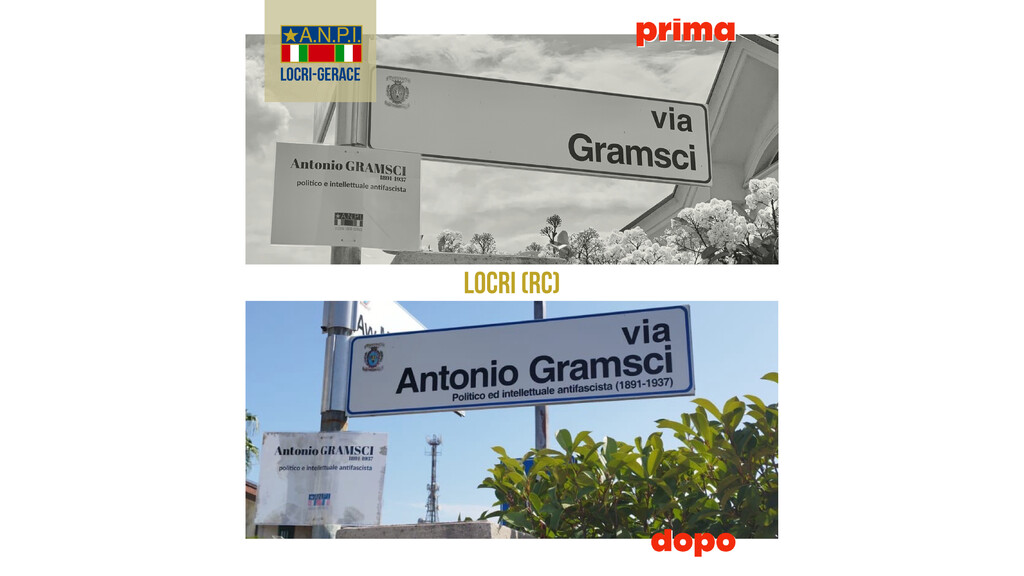 Istituita nella passata consiliatura, fino a quest’oggi la targa apposta non la indicava in maniera completa. Recava, infatti, la sola e vaga dicitura “via Gramsci”. Grazie anche alle segnalazioni di più cittadini, la sezione ANPI di Locri-Gerace - si legge in una nota - ha chiesto all’amministrazione comunale locrese di integrarla, apponendo sotto l’indicazione “Antonio Gramsci” la definizione di “politico e intellettuale antifascista”.