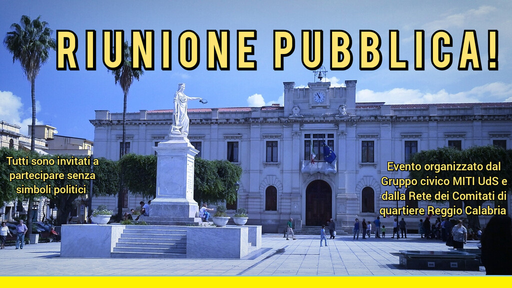 "È tempo di agire! Si invitano tutti i concittadini alla riunione pubblica che ci sarà lunedì 6 novembre 2023, in Piazza Italia (RC), alle ore 16:00. Le motivazioni di tale appello sono sotto gli occhi di tutti: una città ridotta purtroppo ai minimi termini, dove i disservizi sono ormai eventi quotidiani, gran parte delle infrastrutture fatiscenti e inadeguate, cantieri perenni ed opere incompiute in ogni quartiere, mancanza di organizzazione del territorio, economia e turismo quasi inesistenti". È quanto si legge in un comunicato del gruppo civico MITI Unione del Sud e Rete dei Comitati di quartiere di Reggio Calabria.