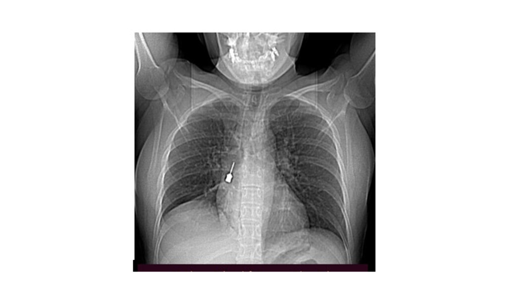 La paziente è giunta al Pronto Soccorso del G.O.M. esibendo un esame di diagnostica per immagini (Tomografia Computerizzata) eseguito a causa di una tosse persistente e di un forte dolore a livello toracico. La TC mostrava la presenza di un corpo estraneo metallico pericolosamente incastrato nel bronco lobare inferiore del polmone destro e un concomitante pneumomediastino, ossia la presenza di aria nello spazio compreso fra i due polmoni.