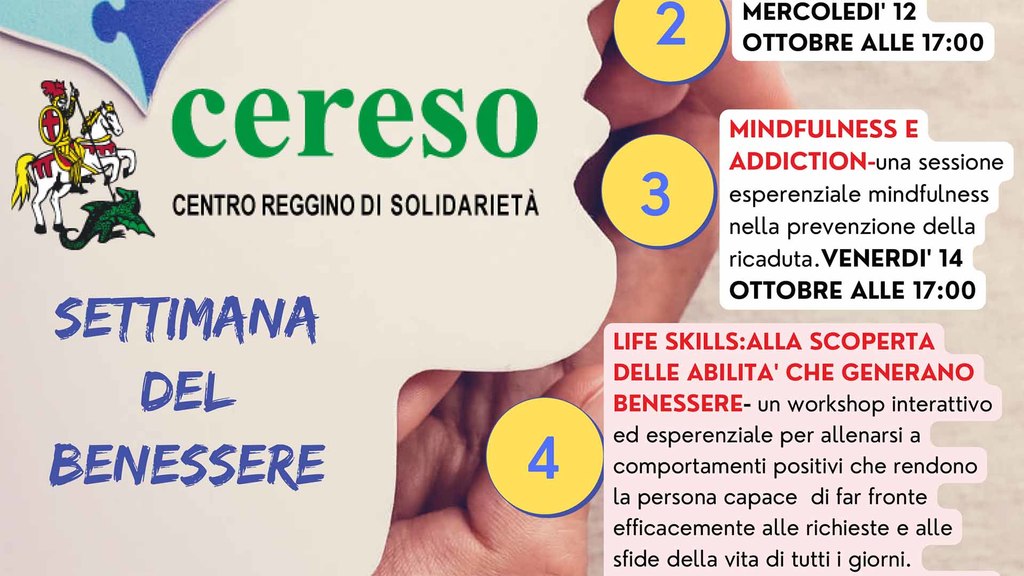 In questa occasione il CeReSo ha scelto di offrire a coloro che lo desiderano, la possibilità di conoscere e sperimentare l’efficacia del programma integrato di trattamento. Nella settimana che va dal 10 al 16 ottobre sono previsti infatti gruppi terapeutici, laboratori psicopedagogici, attività di consulenza e workshop che hanno come comune denominatore la promozione della salute psicologica, la prevenzione del disagio e la cura dalla dipendenza (allegato programma).