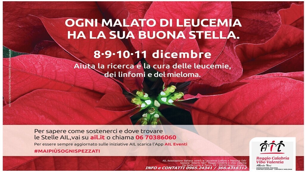 C’è una stella che continua a fiorire per colorare la speranza di chi lotta contro un tumore del sangue, è la Stella di Natale AIL, che quest'anno torneranno a colorare le piazze italiane donando la speranza ai pazienti e alle loro famiglie. Con un contributo minimo di 12 euro potrai portare un aiuto concreto a chi, in uno scenario complesso come quello attuale, sta combattendo contro una leucemia, un linfoma o un mieloma. Nonostante l’aumento generalizzato dei prezzi, AIL ha deciso di non incrementare questo valore, consapevole del difficile momento economico e certa di poter contare sempre sul supporto di chi non vuole far mancare aiuto e assistenza ai pazienti e alle famiglie.