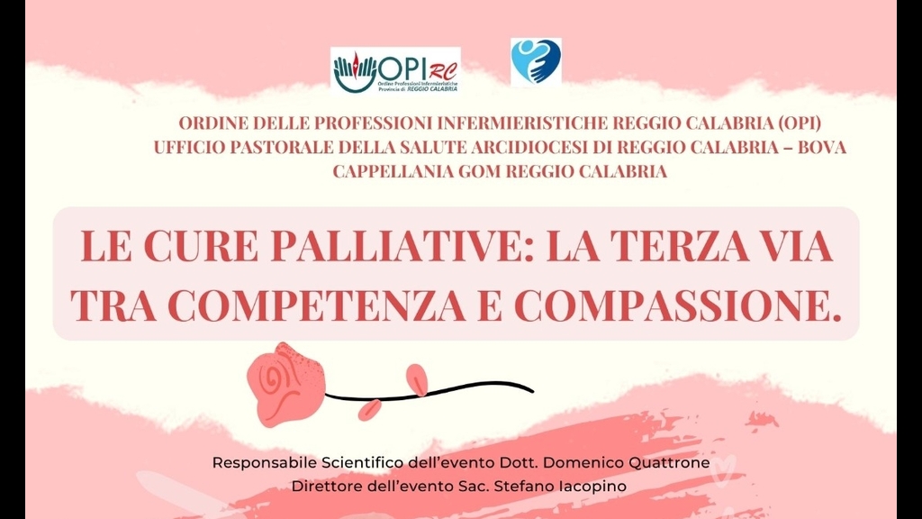 L’incremento progressivo delle malattie croniche ed evolutive, con il conseguente aumento della domanda di servizi dedicati alle cure palliative e alla terapia del dolore, impone oggi la diffusione delle conoscenze scientifiche su cui si fondano le due discipline, sinora relegate a strutture specialistiche dedicate come gli Hospice. La presenza di persone affette da malattie inguaribili, a cui dare risposte adeguate in ogni luogo di cura, interpella un numero sempre maggiore di operatori sanitari che desiderano acquisire strumenti conoscitivi da utilizzare quando anche occasionalmente si trovino a dover prestare assistenza a questa tipologia di ammalati. Con questo intento la Consulta per la pastorale della salute della Diocesi di Reggio – Bova, accogliendo l’invito del Coordinamento regionale, ha organizzato grazie con l'Ordine delle professioni Infermieristiche di Reggio Calabria e La Cappellania del GOM un Corso di Formazione che si terrà giorno 6 maggio a Reggio presso la sala Convegni dal titolo“ Le cure palliative: la terza via tra competenza e compassione”.