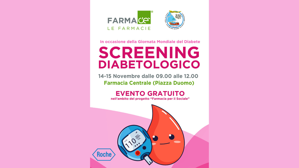 “Sostenere le associazioni del territorio e sensibilizzare sulle tematiche di rilevanza sociale anche in campo sanitario è una delle mission del gruppo FarmaC’è” - è quanto dichiara l’amministratore delegato Domenico Berti - si legge in una nota - annunciando la due giorni di “Screening Diabetologico” che si svolgerà oggi e domani, 14 e 15 Novembre, presso la Farmacia Centrale di Piazza Duomo nell’ambito del progetto Farmacia per il sociale, realizzato in collaborazione con la Consulta comunale Città Metropolitana e decentramento, presieduta da Emilia Condarelli .