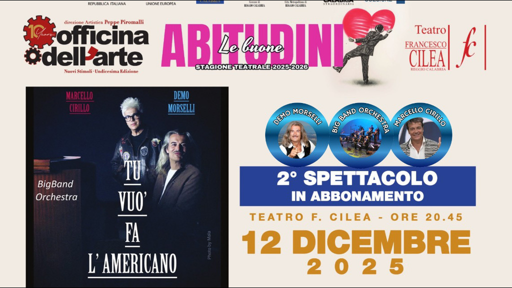 A inaugurare il mese sarà, il 12 dicembre, lo spettacolo “Tu vuò fa l’Americano”, interpretato da Marcello Cirillo e Demo Morselli, accompagnati dalla Big Band Orchestra. Lo show, scritto da Massimo Cinque, porterà sul palco un viaggio musicale vivace e travolgente, tra sonorità swing, atmosfere anni ’50 e il fascino intramontabile della tradizione napoletana riletta in chiave moderna.
