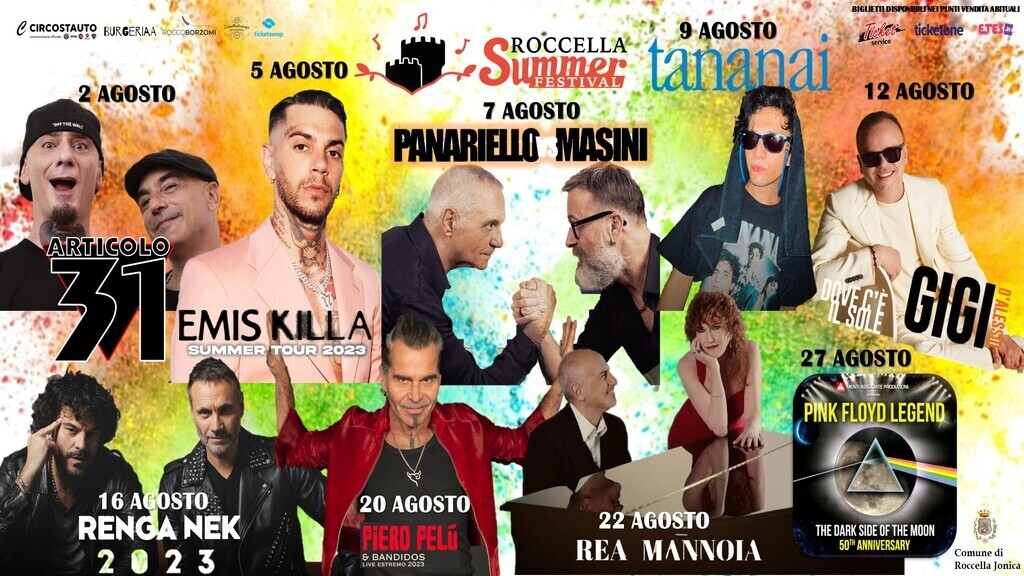 Tornando alla programmazione del 2023, non mancheranno i grandi eventi, come il primo che aprirà il Roccella Summer Festival: è il grande ritorno degli Articolo 31 che arriveranno il 2 agosto al Teatro al Castello per uno degli appuntamenti più attesi dell’estate. A seguire ci sarà il concerto di Emis Killa, previsto per il 5 agosto, mentre due giorni dopo, il 7 agosto, ci sarà l’insolita coppia formata da Giorgio Panariello e Marco Masini che daranno vita a un nuovo spettacolo di musica e risate, “Panariello VS Masini”. Il 9 agosto sarà il turno di Tananai, mentre il 12 agosto salirà sul palco del Teatro al Castello Gigi D’Alessio. Il 16 agosto ci sarà un’altra coppia inedita, quella formata da Nek e Francesco Renga che faranno un concerto insieme. Il 20 agosto sarà il ciclone Piero Pelù a invadere Roccella Jonica, mentre il 22 agosto spazio alla raffinatezza di Fiorella Mannoia che ritornerà al Teatro al Castello in una nuova veste, questa volta insieme al pianista Danilo Rea. Chiuderà la programmazione uno spettacolo dedicato al cinquantesimo anniversario della pubblicazione di “The dark side of the moon”, il celebre album dei Pink Floyd, il 27 agosto con i Pink Floyd Legend.