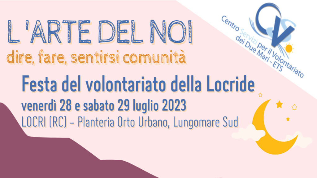 Dopo una settimana esatta dall’edizione di San Ferdinando, fa sosta nella Città di Locri il format di promozione del volontariato ideato e promosso dal Centro Servizi per il Volontariato dei Due Mari – ETS per celebrare L’ARTE DEL NOI: due serate, venerdì 28 e sabato 29 luglio, durante le quali volontarie e volontari di diversi gruppi della Locride - 5 D ODV di Bovalino, Adisco ODV di Locri, Aido ODV di Locri, Auser Noi ci siamo ODV di Bovalino, Avis ODV di Locri, Avis ODV di Mammola, Avo ODV di Siderno-Locri, Croce Viola ODV di Mammola, Consulta delle Associazioni di Siderno, Do ut des per il Progetto di Leo APS di Africo, I girasoli della Locride ASD, Istituto per la famiglia sez. 174 ODV di Ferruzzano, Lados ODV di Bianco, Orizzonte7 APS di Bovalino, Saved Marve ODV di Ferruzzano, P. A. Siderno Soccorso ODV, Thalassemici Locride ODV di Natile di Careri, VII Coorte AIB ODV di Grotteria – metteranno al centro parole per dire, gesti per fare ed esperienze per sentirsi comunità, come recita il sottotitolo dell’evento.