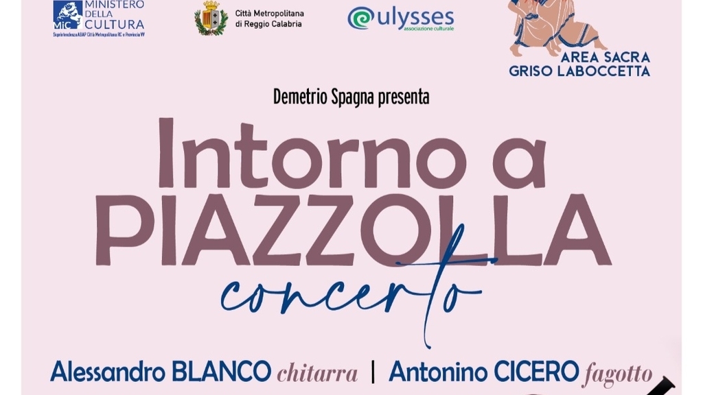 Il concerto dal titolo “INTORNO A PIAZZOLLA” è un viaggio tra i musicisti e le orchestre che hanno formato uno dei più importanti compositori della storia del tango. Il 26 agosto alle 21,30,presentati da Demetrio Spagna, si esibiranno nell’Area archeologica Griso Laboccetta Antonino Cicero(fagottista) e Alessandro Blanco (chitarrista), due musicisti di fama internazionale. Da anni condividono la passione per il Tango che li ha portati ad esibirsi in più di 50 concerti in milonghe e festivals di settore.