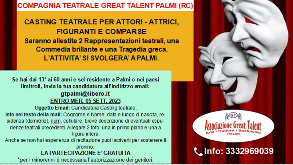 Settembre si sa che è il mese che segna l’inizio di tutte le attività, e anche la compagnia teatrale “Great Talent” di Palmi, diretta dal regista Giovanni Parrello, dopo la pausa estiva, che ha fatto seguito al grande successo ottenuto con la rappresentazione teatrale “Assassinio sul Nilo” di Agatha Christie, che a fine maggio ha fatto registrare il sold-out per cinque rappresentazioni che si sono susseguite alla Casa della Cultura “Leonida Repaci”, si presenta al pubblico degli appassionati di teatro con un bel progetto che prevede l’allestimento di due rappresentazioni teatrali, una commedia brillante e una tragedia greca. È noto oramai che la compagnia teatrale “Great Talent” si cimenta con riconosciuta abilità e competenza nella realizzazione di opere del repertorio teatrale classico, variando di volta in volta tra i diversi generi teatrali, e raggiungendo sempre ottimi risultati, sia dal punto di vista tecnico, sia dal punto di vista del gradimento da parte del pubblico. Non sono state ancora rese note le due opere che saranno realizzate, ma sono stati indicati i periodi in cui le due rappresentazioni teatrali saranno portate in scena. La commedia sarà pronta per il periodo natalizio 2023, e la tragedia sarà portata in scena la prossima estate, a metà luglio 2024. L’associazione “Great Talent”, di cui è attualmente presidente Luisa Anastasio, ha diramato un avviso per la partecipazione ai casting teatrali gratuiti, per la scritturazione di attori, attrici, figuranti e comparse, rivolto a persone residenti a Palmi o nei paesi limitrofi, e che hanno voglia di cimentarsi nell’attività teatrale. Per iscriversi ai casting gratuiti è necessario inviare una email all'indirizzo: gtpalmi@libero.it entro martedi 5 settembre 2023. La partecipazione ai casting è aperta a persone dai 13 ai 60 anni (per i minori è necessaria l’autorizzazione dei genitori); possono partecipare ai casting anche persone che non hanno avuto esperienze nel campo teatrale. Dalle informazioni rese note al momento dagli organizzatori, risulta che saranno composti due cast, per un totale di circa sessanta partecipanti, maschi e femmine di varie età. Si darà inizio a una nuova attività teatrale sfidante e coinvolgente, che sarà un’ottima occasione di impegno e di svago per l’imminente arrivo dell’autunno e della stagione invernale. E se saranno mantenuti gli standard che fino al recente passato ha fatto registrare la compagnia teatrale “Great Talent” di Palmi, questo nuovo progetto teatrale sarà un’importante occasione di divertimento sia per coloro che faranno parte dei cast, sia per il pubblico degli spettatori che potranno godere di due belle rappresentazioni teatrali realizzate da artisti locali.