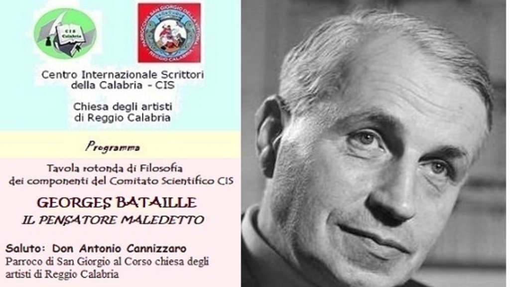 Mercoledì 25 ottobre 2023, alle ore 17:30, presso la Sala San Giorgio della chiesa degli artisti di Reggio Calabria, il Centro Internazionale Scrittori della Calabria e la stessa chiesa promuovono la tavola rotonda di filosofia dei componenti del Comitato Scientifico del Cis dal titolo “Georges Bataille: il pensatore maledetto”. Aprono l’incontro gli interventi di don Antonio Cannizzaro, parroco della chiesa San Giorgio al Corso e Loreley Rosita Borruto, presidente del Cis della Calabria. Intervengono alla tavola rotonda: Gianluca Romeo, docente di Storia e Filosofia; Giuseppe Verdirame, direttore scientifico dell’Istituto Europeo di Studi Politici di R. C; Franco Iaria, Scienze politiche; Glauco Morabito, docente di Storia e Filosofia; Giovanni De Girolamo, critico letterario e d’arte. Modera la tavola rotonda Gianfranco Cordì, docente di Storia e Filosofia. Georges Bataille (Billom, 1897 – Parigi 1962) è stato scrittore, antropologo e filosofo di vasti interessi.