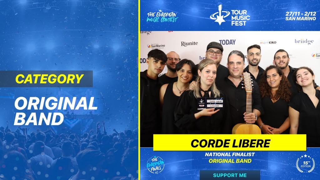 Originali, talentuosi e sicuramente dal grande impatto sonoro, i Corde Libere, con la loro musica originale e una grande determinazione, sono riusciti a convincere l’esigente giuria del Tour Music Fest. Con il loro approccio maturo e una capacità decisamente rara di saper giocare con la musica in maniera originale, la band si è aggiudicata l’accesso alla Finale del Band Contest, che si terrà il 30 Novembre presso la Sala Little Tony di San Marino. Qui affronterà la sfida da sostenere per arrivare a calcare il palco della Finalissima del Tour Music Fest il 2 Dicembre al Teatro Nuovo Di San Marino.