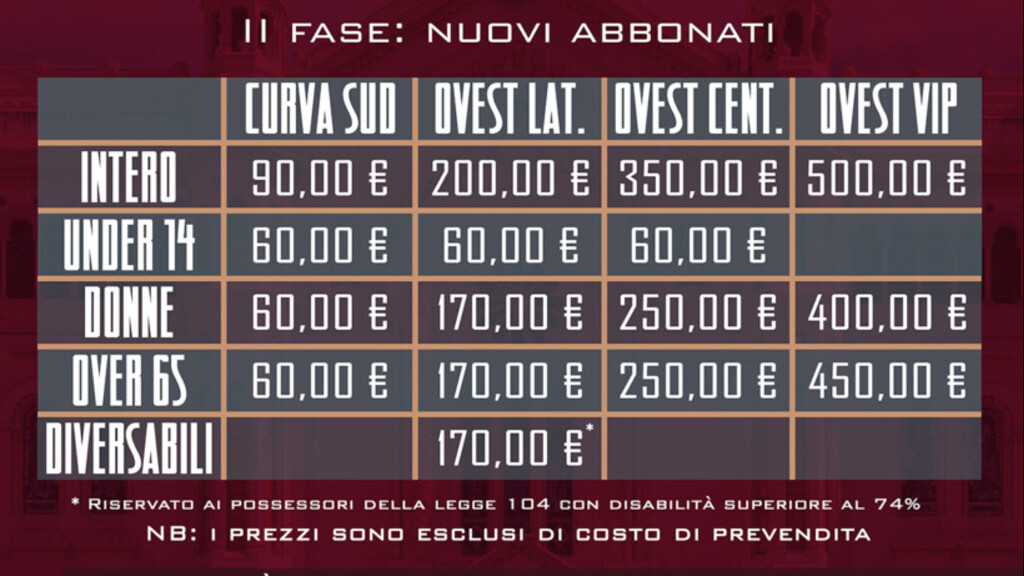 OVER 65: Curva Sud € 60, Tribuna Laterale € 170, Tribuna Centrale € 250, Vip € 450