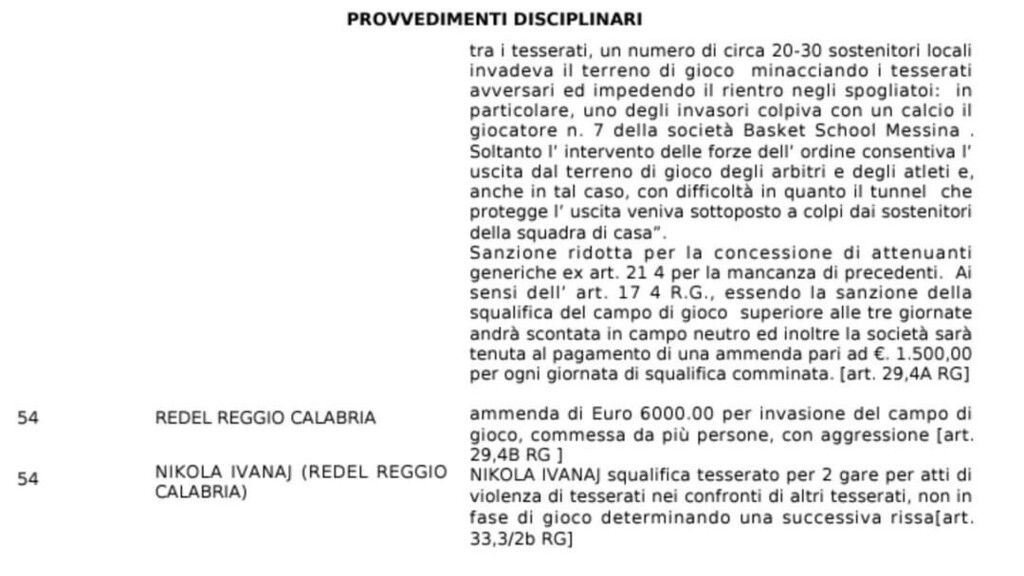E' questo il contenuto del comunicato stampa diffuso dalla Redel Reggio Calabria in seguito alla decisione del Giudice sportivo di comminare quattro giornate di squalifica del Palacalafiore, 12 mila euro di multa e la squalifica per due giornate di Nikola Ivanaj, dopo i fatti verificatisi al termine del derby contro Basket School Messina di domenica scorsa.