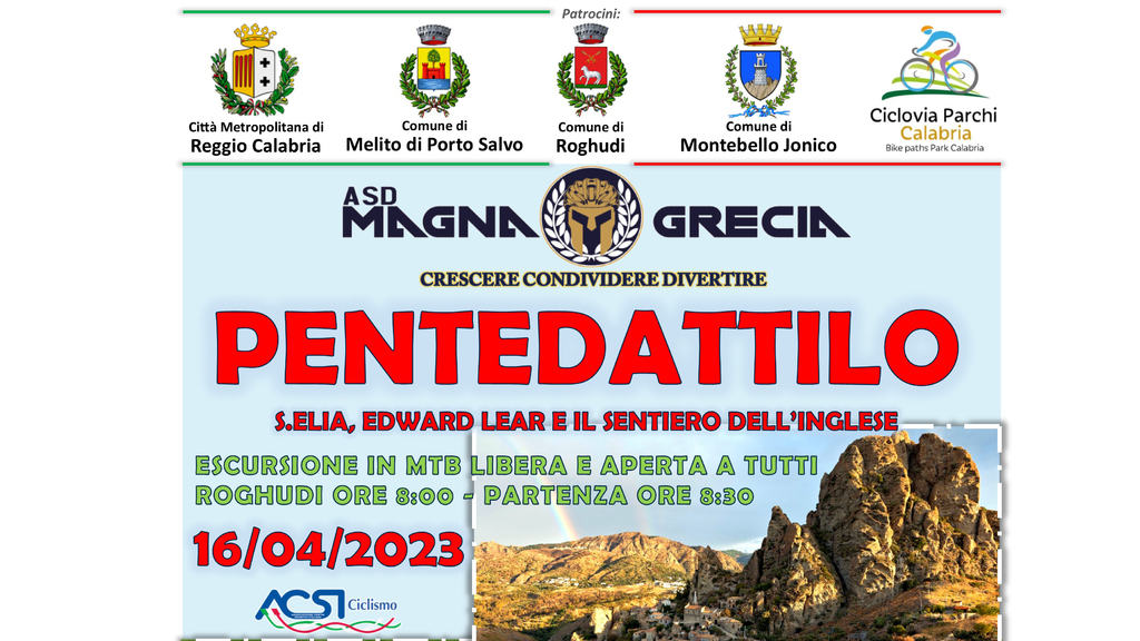 L’ASD Magna Grecia - è scritto in una nota - organizza per domenica 16 aprile un’escursione in MTB aperta a tutti gli appassionati delle due ruote. Ai partecipanti sarà proposto di pedalare attraversando i Comuni di Roghudi, Melito di Porto Salvo e Montebello Jonico, un itinerario di 30 Km, suggestivo e panoramico, alla “ricerca” del Borgo arroccato. La partenza, prevista per le 8:30, avverrà dalla Piazza Municipio di Roghudi per andare in direzione delle località di Musa, Caracciolino, Saline, Mantineo, Prastarà, Masella, Pentedattilo e poi tornare al punto di partenza in un tempo complessivo stimato di circa tre ore. Un viaggio turistico e culturale alla riscoperta storica del territorio che ci circonda.