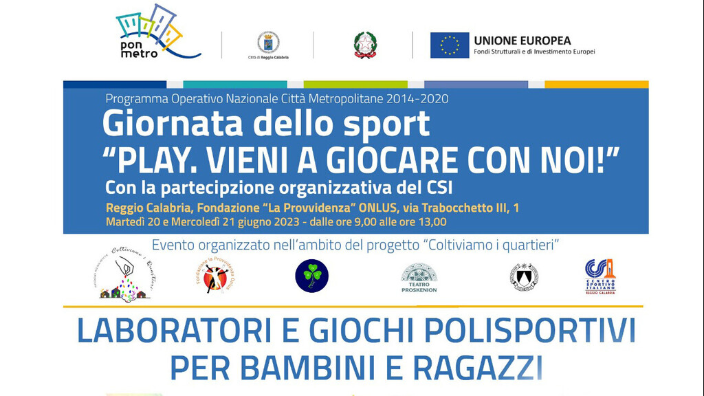 Martedì 20 e Mercoledì 21 Giugno dalle ore 09.00 alle ore 13.00 presso le aree esterne e cortili della Fondazione “La Provvidenza” ONLUS in Via Trabocchetto III nr. 1 di Reggio Calabria - si legge in una nota - si terrà un importante iniziativa sportiva, organizzata in partenariato tra la Fondazione “La Provvidenza” ONLUS (capofila), l’Organizzazione di Volontariato Agiduemila, l’Associazione Culturale Proskenion e l’Associazione “San Domenico”, con la partecipazione organizzativa del CSI Reggio Calabria, nell’ambito del progetto “Coltiviamo i quartieri” rientrante nel più ampio bando “Reggio Resiliente”, finanziato con i fondi PON-METRO 2014/2020.