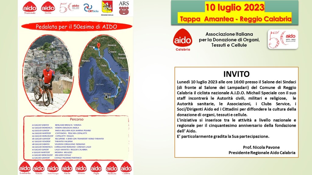 Nel quadro delle iniziative nazionali e regionali relative al cinquantesimo anniversario della Costituzione dell’ A.I.D.O. – Associazione Italiana per la Donazione di Organi, Tessuti e Cellule si inserisce il complesso progetto che ha come protagonista Michail Speciale, ciclista amatoriale di Partinico e testimonial di Aido Sicilia, in un percorso di 2500 chilometri in bici in solitaria con al seguito un’ auto ammiraglia che partito da Bergamo il 10 luglio 2023 sta attraversando in tredici tappe tutta l’Italia fino a Palermo Partinico ove giungerà prossimamente il 13 luglio 2023.