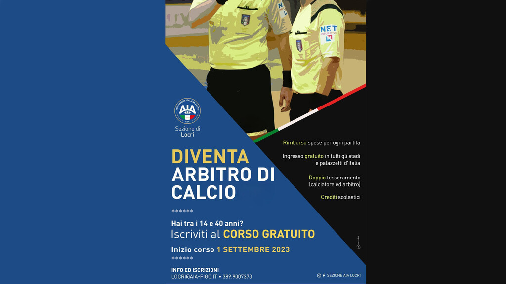 In seguito alla riunione di presentazione dei corsi tenutasi giorno 1 settembre, si comunica che entro metà mese avranno inizio le lezioni presso la sezione di Locri sita vicino la stazione ferroviaria, tenute dai dirigenti sezionali delegati. I corsi per la qualificazione di arbitro di calcio e calcio a 5 prevedono il rilascio della tessera associativa per ingresso in tutti gli stadi e i palazzetti d’Italia, il riconoscimento dei crediti formativi scolastici, il doppio tesseramento con società calcistiche fino ai 18 anni e il rimborso spese per ogni gara che verrà svolta.