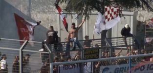 Emblematica l'immagine dei tifosi amaranto collocati in piedi dietro una rete